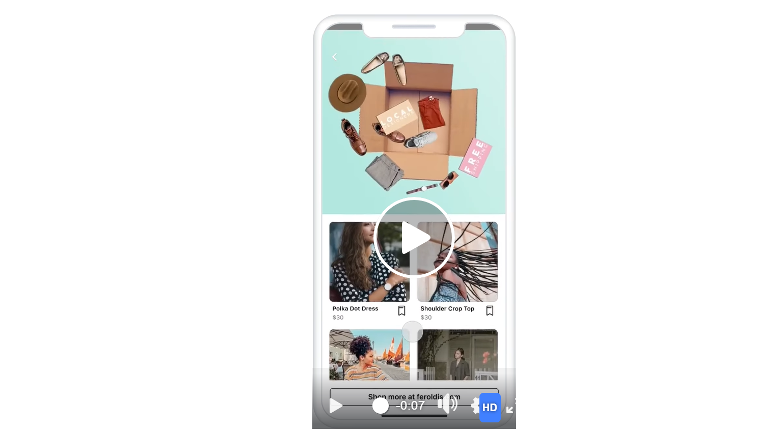 広告をタップすると、インスタントエクスペリエンスが表示されます。インスタントエクスペリエンスとは、モバイル端末で広告をタップした際にフルスクリーンで表示される広告フォーマットを指します。外部の自社サイトへ遷移する前に、アプリ内で詳細ページのような画面を表示できるため、商品名や価格、説明文などをより大きく見せることが可能です。ユーザーの離脱を抑えながら、段階的に商品理解を深めてもらえる設計になっています。