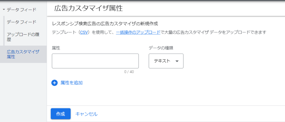 広告カスタマイザを利用するためには、まず「フィード(広告カスタマイザ属性)」を作成します。フィードの登録方法は大きく2つあります。1つは管理画面上で直接入力する方法、もう1つはエクセルやスプレッドシートを用いて一括登録する方法です。