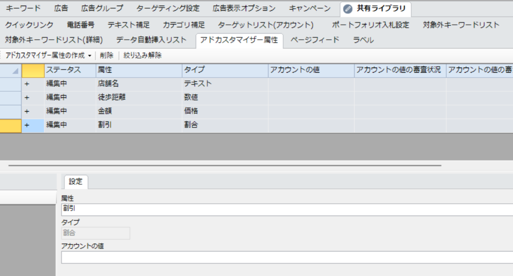 データフィードはCSVやスプレッドシート形式で作成します。フィードには、属性名(例:店舗名)、データの種類(テキスト・価格・数値など)、そしてキャンペーン・広告グループ・キーワードなどの適用条件を含めます。作成したファイルを「ツールと設定」からアップロードし、エラーがないことを確認したうえで適用します。