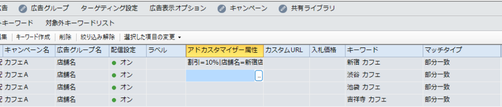 一方で、最終ページURLは広告カスタマイザでは変更できません。URLの出し分けはキーワード単位で設定する仕組みとなっています。